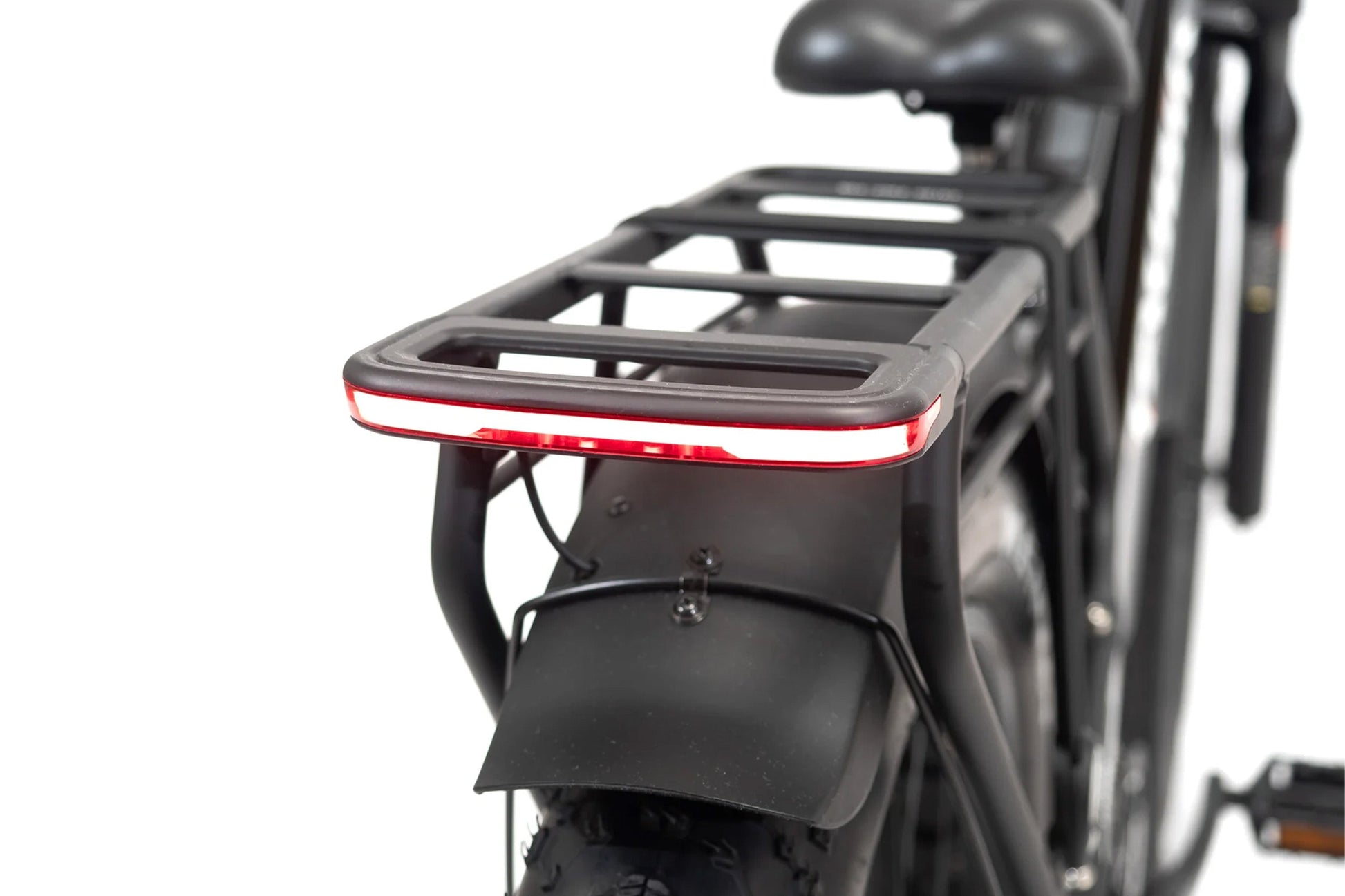 The bike now sports a rear rack equipped with an integrated brake light. This design boasts a night mode and a brake sensor, complemented by an additional secondary light.
