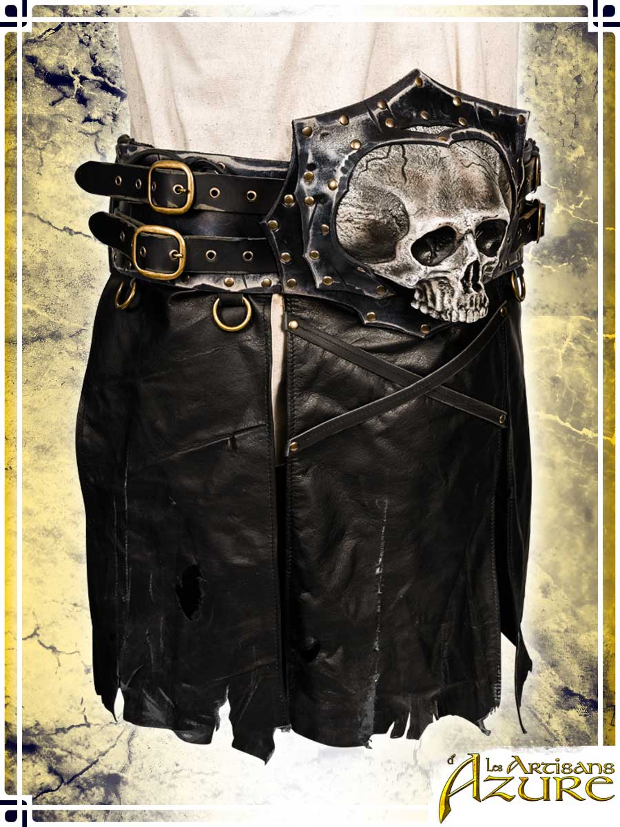 Available with or without the skull, the combat belt is a wide and imposing piece with a double set of belts as well as metal rings that can be used to hold armored tassets or various grim talismans and accessories. Long pieces of supple leather hang from the belt, a battle skirt of the sort that lengthens the figure and add some flare to the character when in motion. The belts can also support all the classic gear needed in LARP such as a scabbard or a matching pouch. Because of the aging patina and the voluntary use of imperfect hides to craft these sets, each piece is guaranteed to have subtle unique features, natural skin texture, and scars enhancing the final product with details that cannot easily be imitated by the artisan, making it the perfect belt for a death cultist, evil champions or any other revenants.