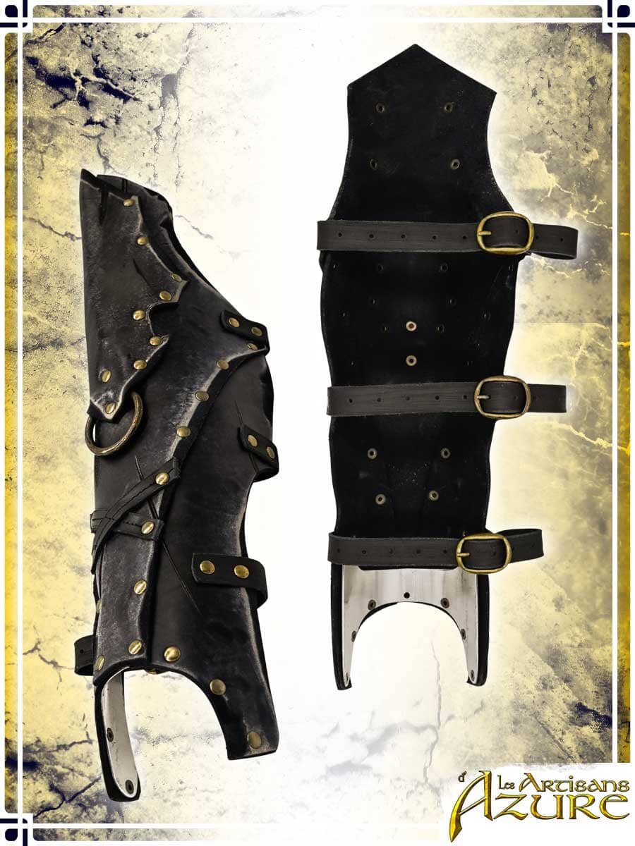 These dark fantasy leather greaves display a rough and aged finish that fits perfectly for undead warriors, dark champions, dread knights, and grim executioners in LARP. Adjustable with straps, they are further embellished by the use of imperfect leather, each piece having its own little scars, scratches and texture that makes them look more rugged.
