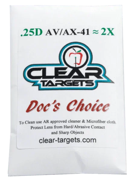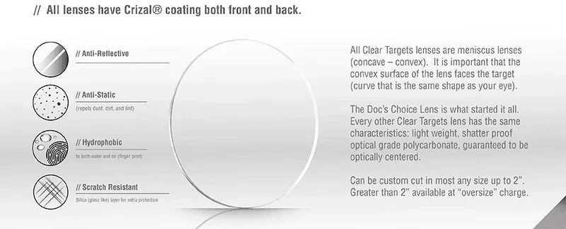 Doc’s Choice Lens is developed by Essilor with the Crizal 9-Step finish. It allows you to see a sharp clear target with no distortions, no reflections, shatterproof, no glare, oil & water repellant, and fingerprint resistant lens.