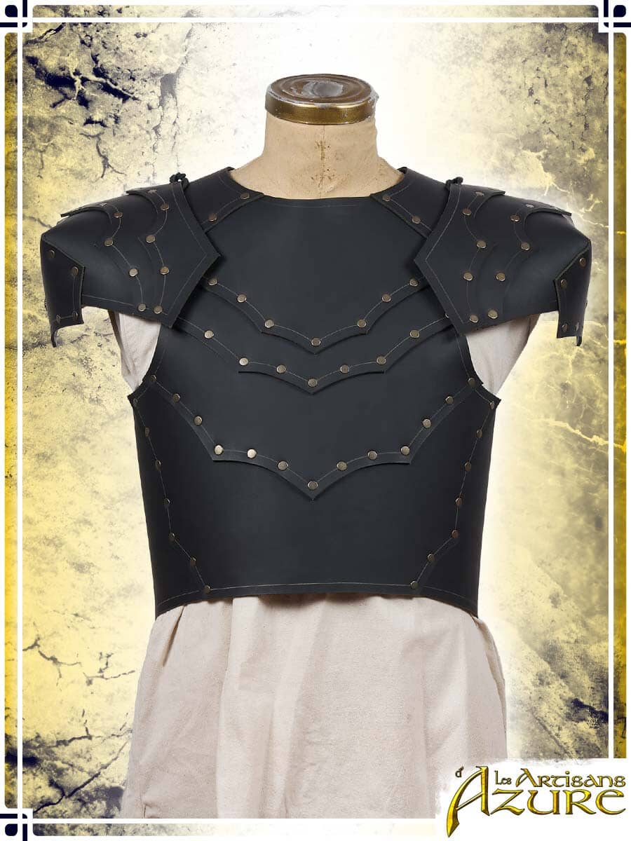 This leather medieval fantasy armor for LARP is a good starting point for an adventurer, fighter, warrior, barbarian, ranger, or any combat oriented character getting geared for new challenges. It can be combined with various armor pieces to increase body protection, and offers good mobility in combat. This set includes a pair of pauldrons.