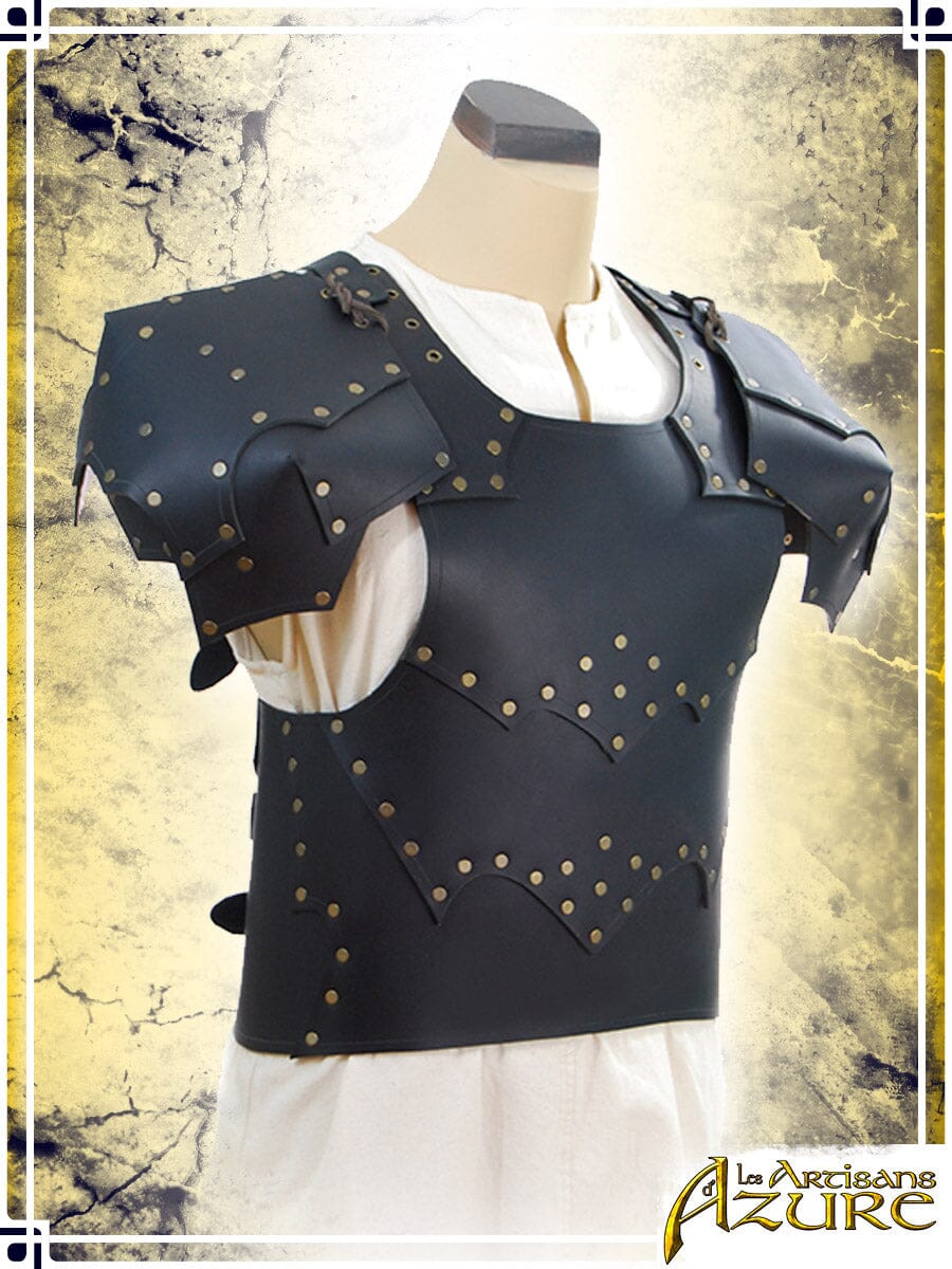This leather armor set is perfectly suited for warriors, brutes, and adventurers in LARP and other medieval fantasy events. Featuring both an adjustable cuirass and removable pauldrons, it is sturdy, versatile and perfect for active combat, with the open back offering better aeration and mobility than a closed armor.