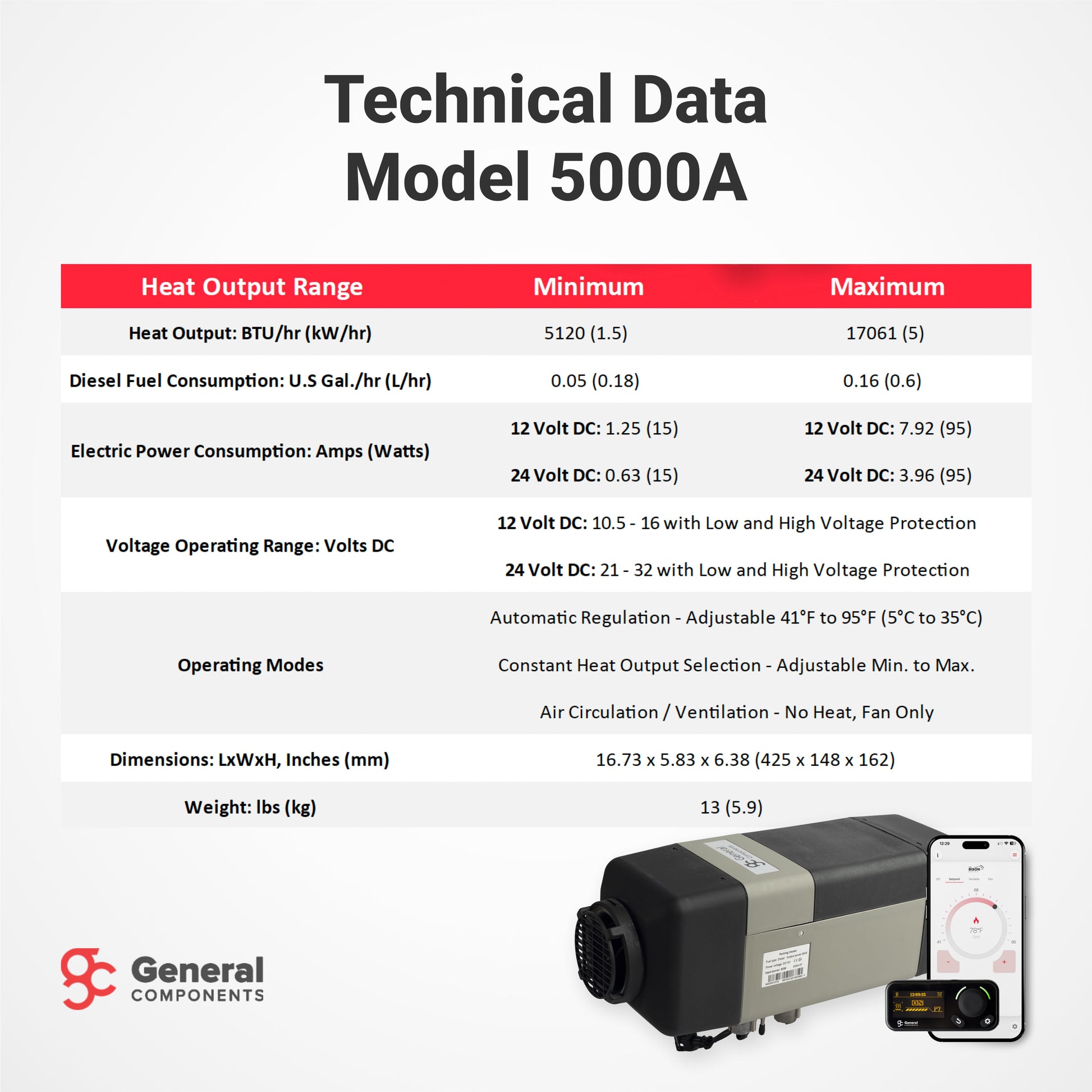 - High-Performance Heating: Delivers a powerful 5kW (17,000 BTU) forced air heating capacity for large vehicles and vessels.