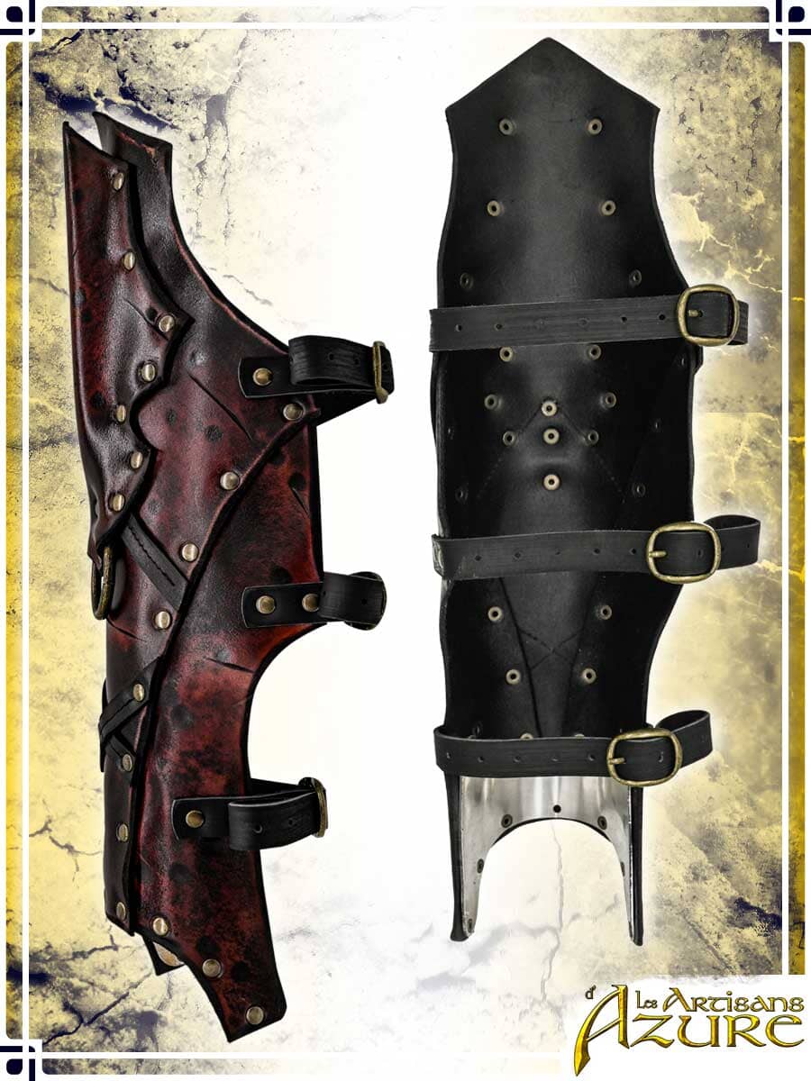 These dark fantasy leather greaves display a rough and aged finish that fits perfectly for vampire warriors, dark champions, chaos knights, and grim executioners in LARP. Adjustable with straps, they are further embellished by the use of imperfect leather, each piece having its own little scars, scratches and texture that makes them look more rugged.