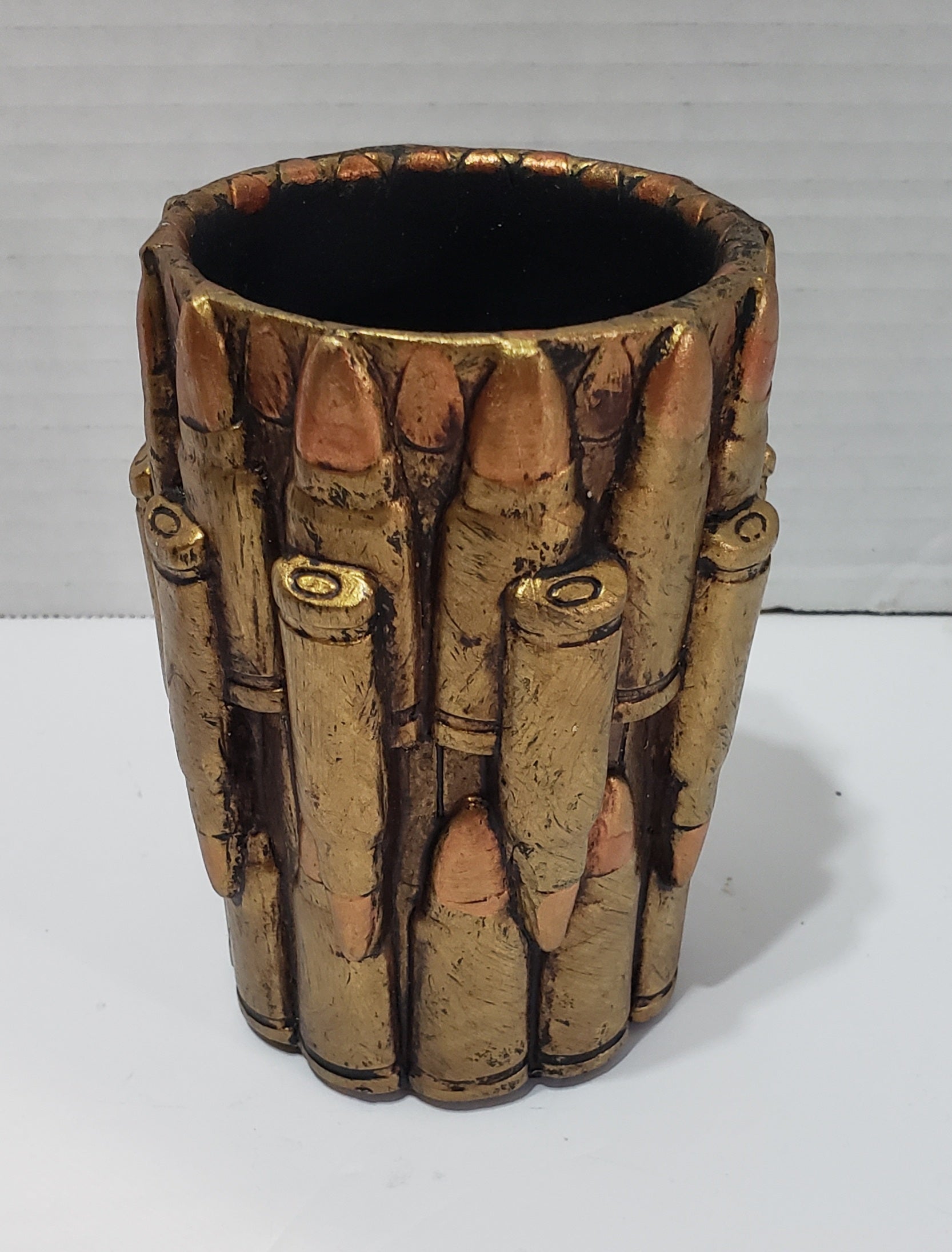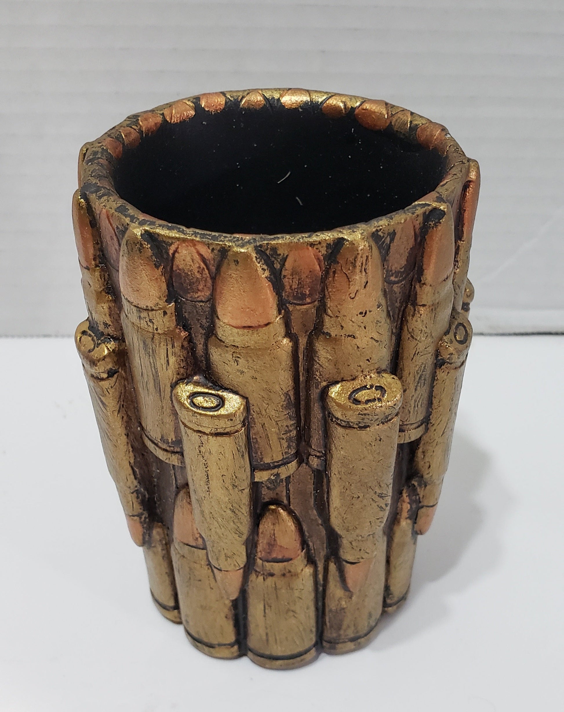 - Add a touch of grit to your decor with this rifle ammo bullets bathroom accent accessory. Painted in gold tone, we align these sculptural bullets to form a sink tumbler.