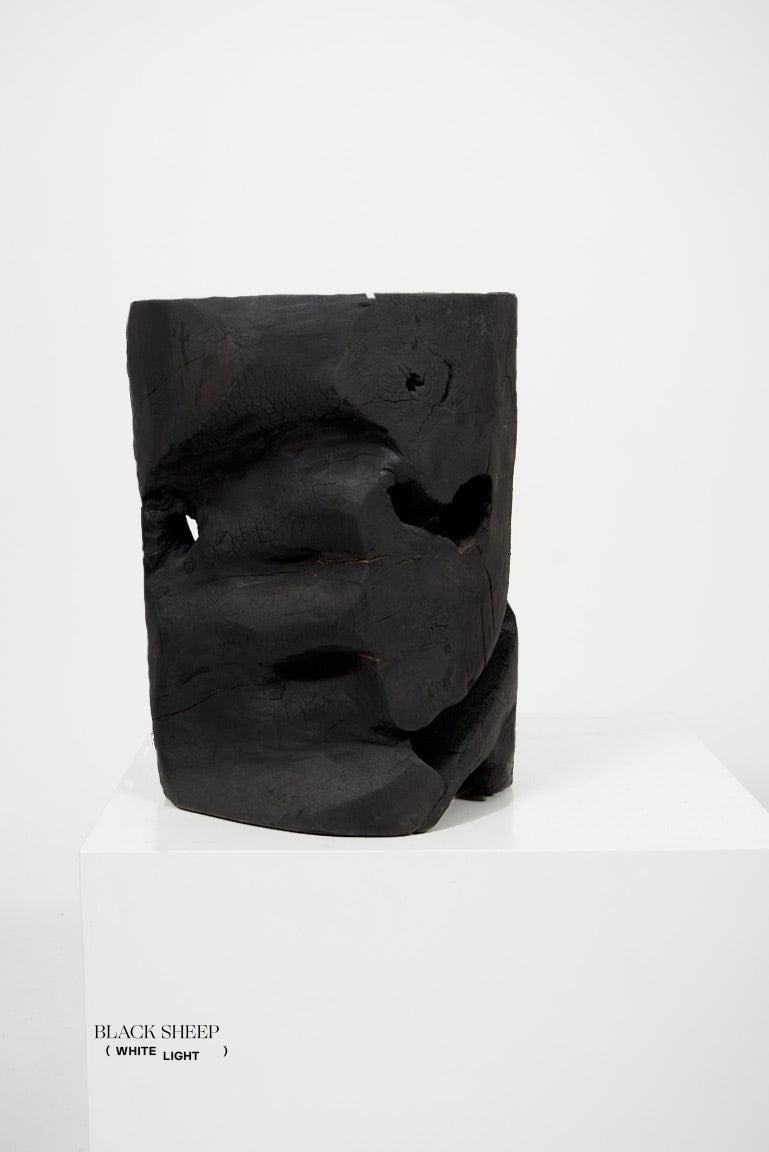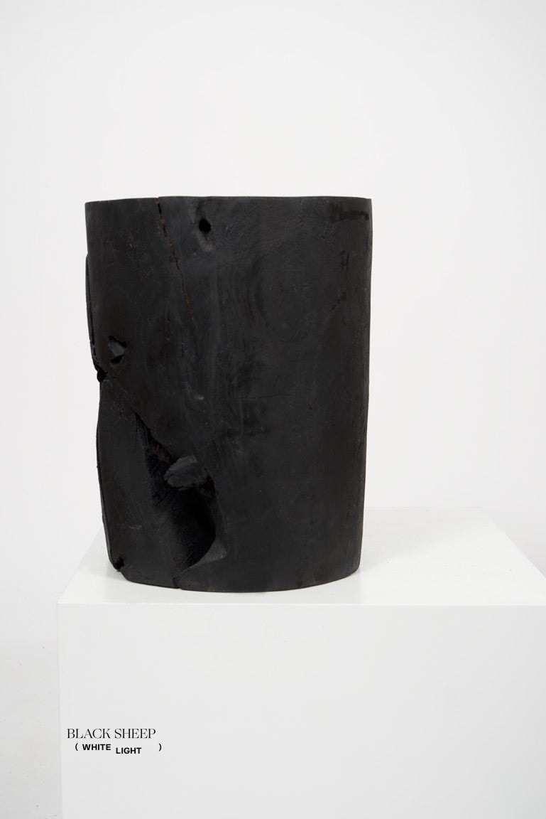 A round solid piece of charred teak suitable for use as a side table or stool.