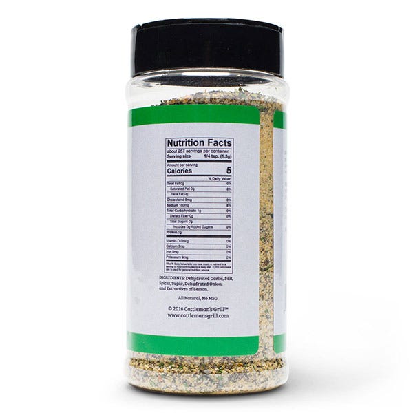 Ingredients: Dehydrated garlic, salt, spices, sugar, dehydrated onion, and extractions of lemon.