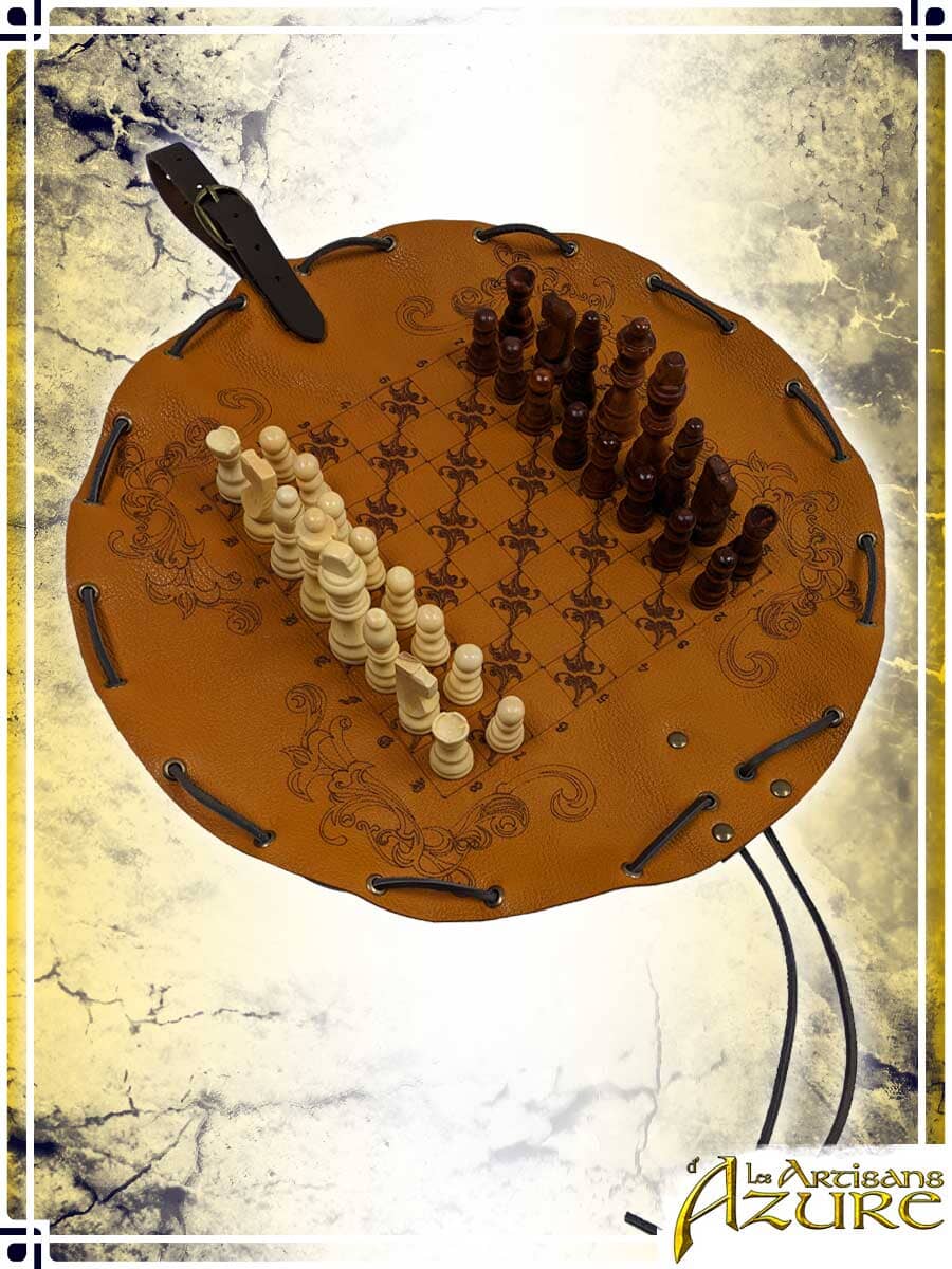 This chess game is the perfect accessory to entertain yourself and test your tactical skills during a LARP event, without leaving yourself vulnerable to surprise attacks. You can keep your attention 100% focused on the game, knowing that, thanks to its practical design, the chessboard can be folded in an instant and all its pieces gathered inside the bag, easy to carry away from danger, or even into combat, attached to your belt. Gone is the time of the heavy wooden boards, your are now ready to adventure with your transportable chess game !