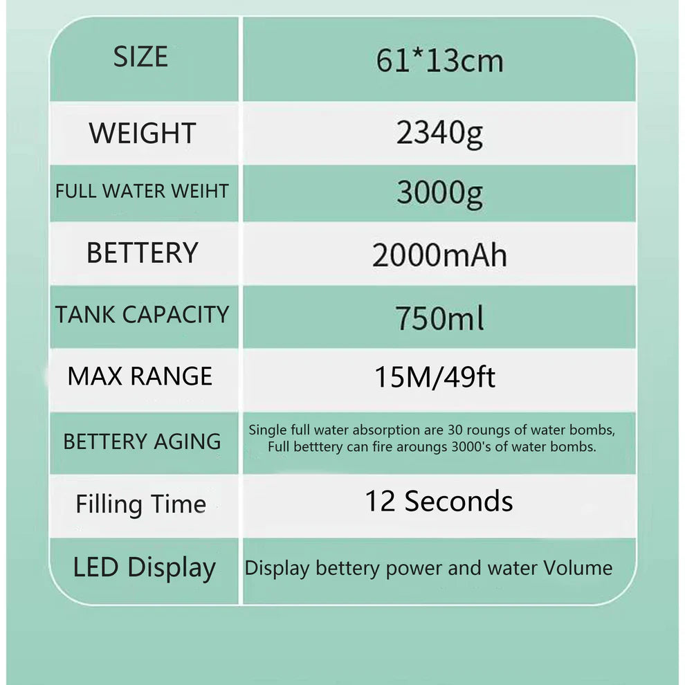 - Non-stop Action: Automatically reloads in just 12 seconds by submerging the nozzle in water.