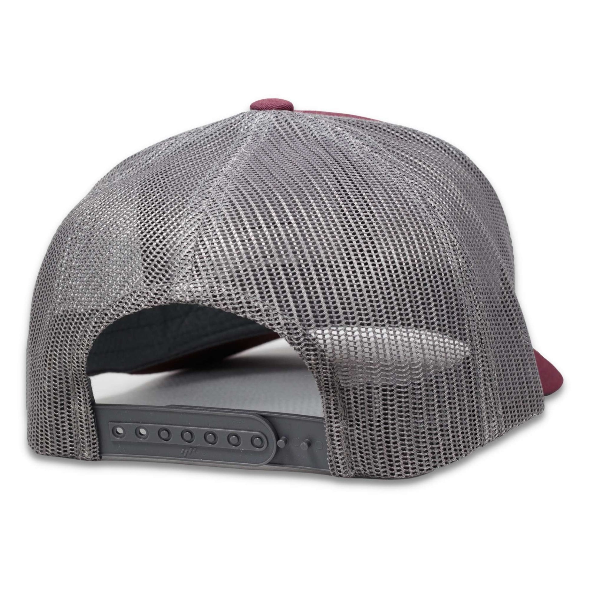 Structured, breathable, and ready for anything. This Maroon / Gray mid-profile Yupoong trucker cap brings mesh airflow, a curved brim, and snapback comfort