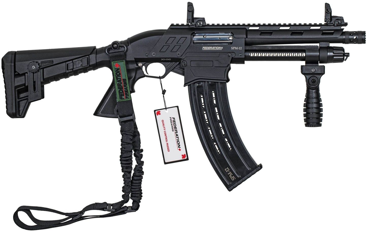 The Federation Firearms SPM-12 Shorty is a magazine-fed pump-action shotgun designed for reliability and durability. It features a full-length polymer barrel rail, faux flash hider, flip-up sights, Federation Firearms branded sling, and a 10-round magazine. The SPM-12 Shorty has a barrel length of 9 inches and a chamber of 3 inches, making it a versatile choice for various shooting applications.
