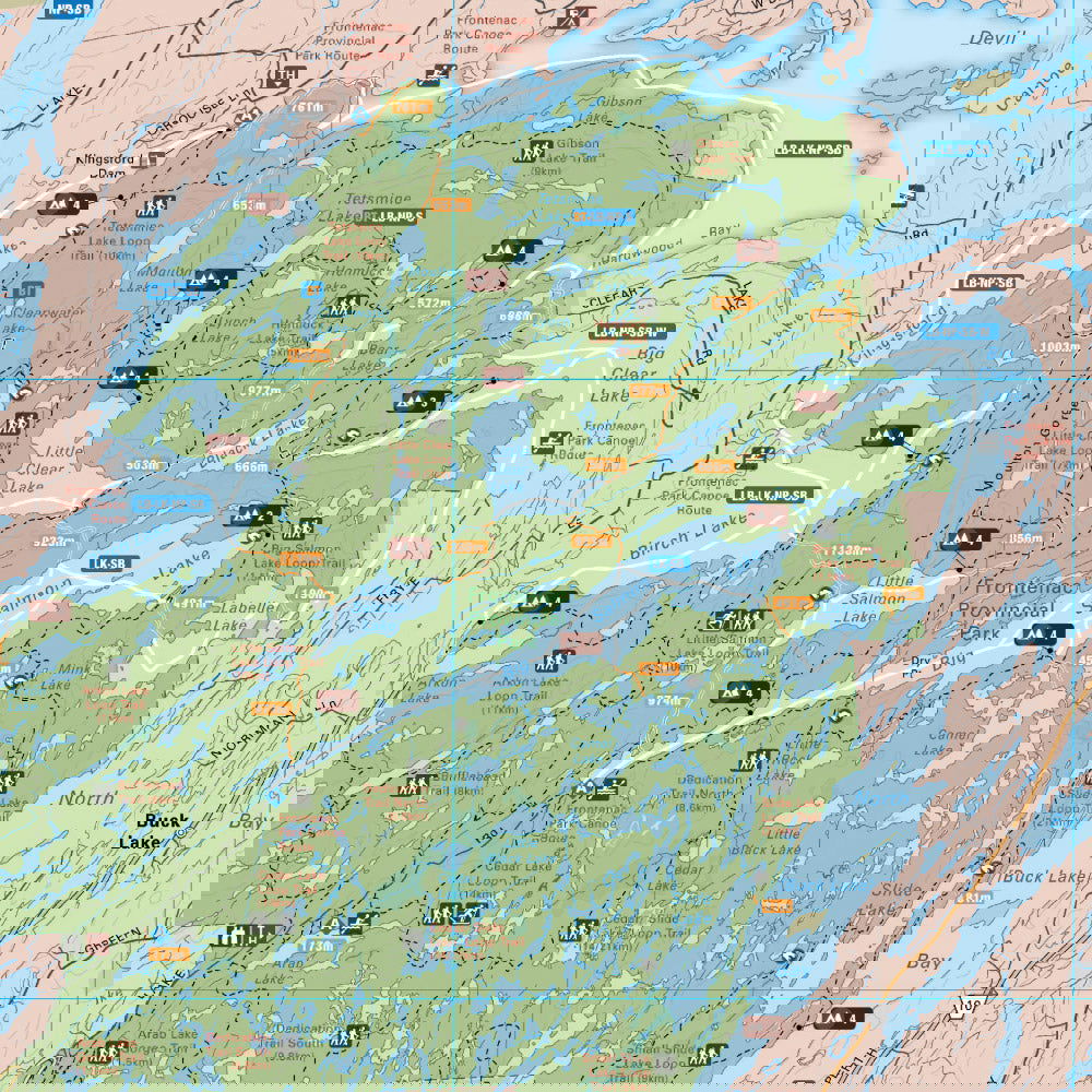 Covering Frontenac Provincial Park in eastern Ontario, this map features the hiking trails, campsites, paddling routes, portage routes, fish species and lakes in the area. Use for canoeing, camping, exploring, fishing, hiking, kayaking, skiing, wildlife viewing and more. With 1:10,000 water and trail data, no other map for the area provides you with this level of recreational or topographic detail. This 1:25,000 scale printed map includes Frontenac Provincial Park, Bedford Mills, Raymonds Corners, Sydenham, Big Clear Lake, Big Salmon Lake, Birch Lake, Buck Lake, Canoe Lake, Cedar Lake Loop, Devil Lake, North Otter Lake, Slide Lake and more!