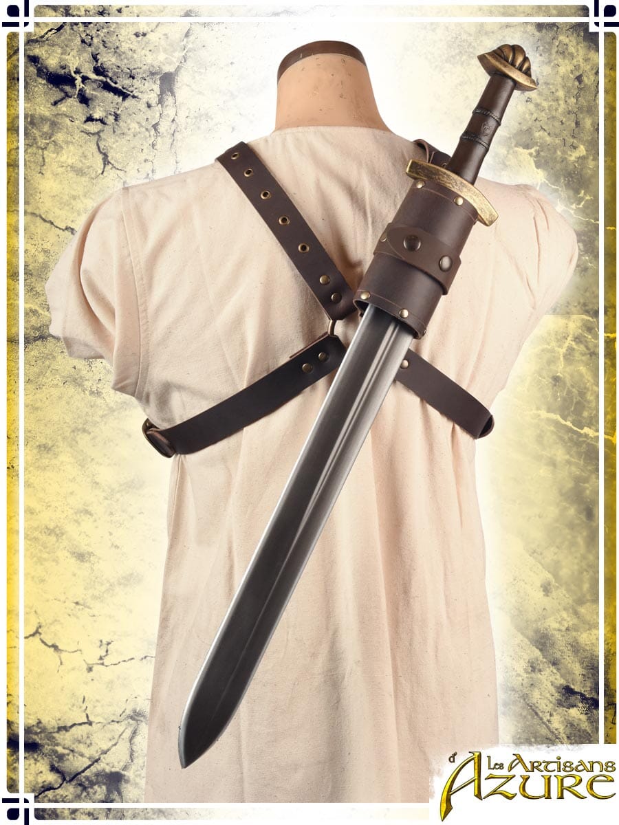 This adjustable leather harness is held in place by a central ring on the back and in the middle of the chest. The perfect accessory to enhance the torso, it can support any of our pauldrons, and can be used to carry a various array of scabbards, pouches and accessories. This harness is especialy useful to free some space around the waist in LARP.