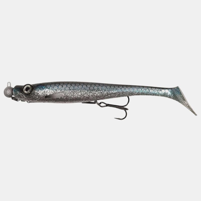 This full-body soft-plastic swimbait delivers a tail-thumping action and a side-to-side roll or shimmy that entices big fish to strike. Super-soft, yet durable. Rigged with Mustad jig head. Ready to fish!