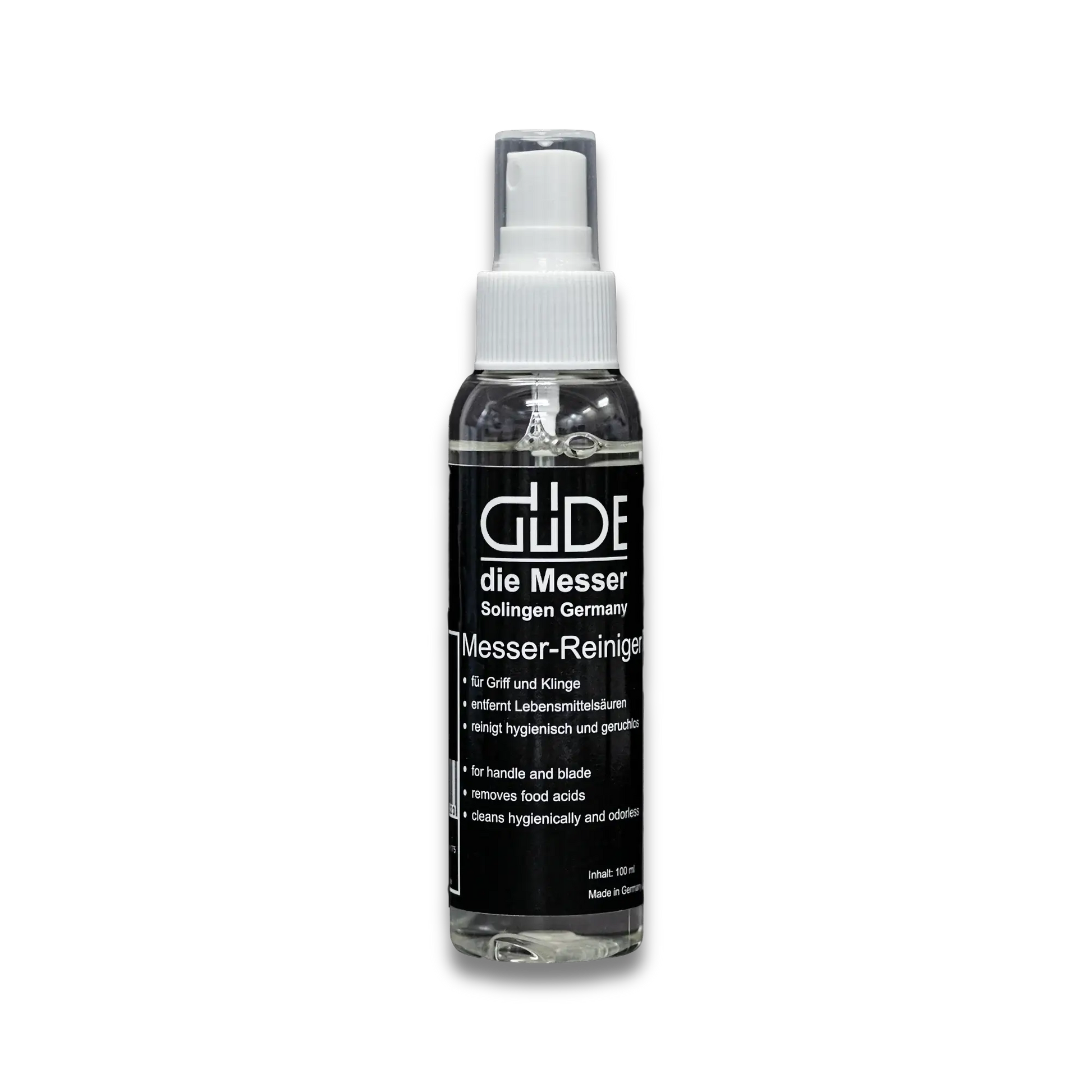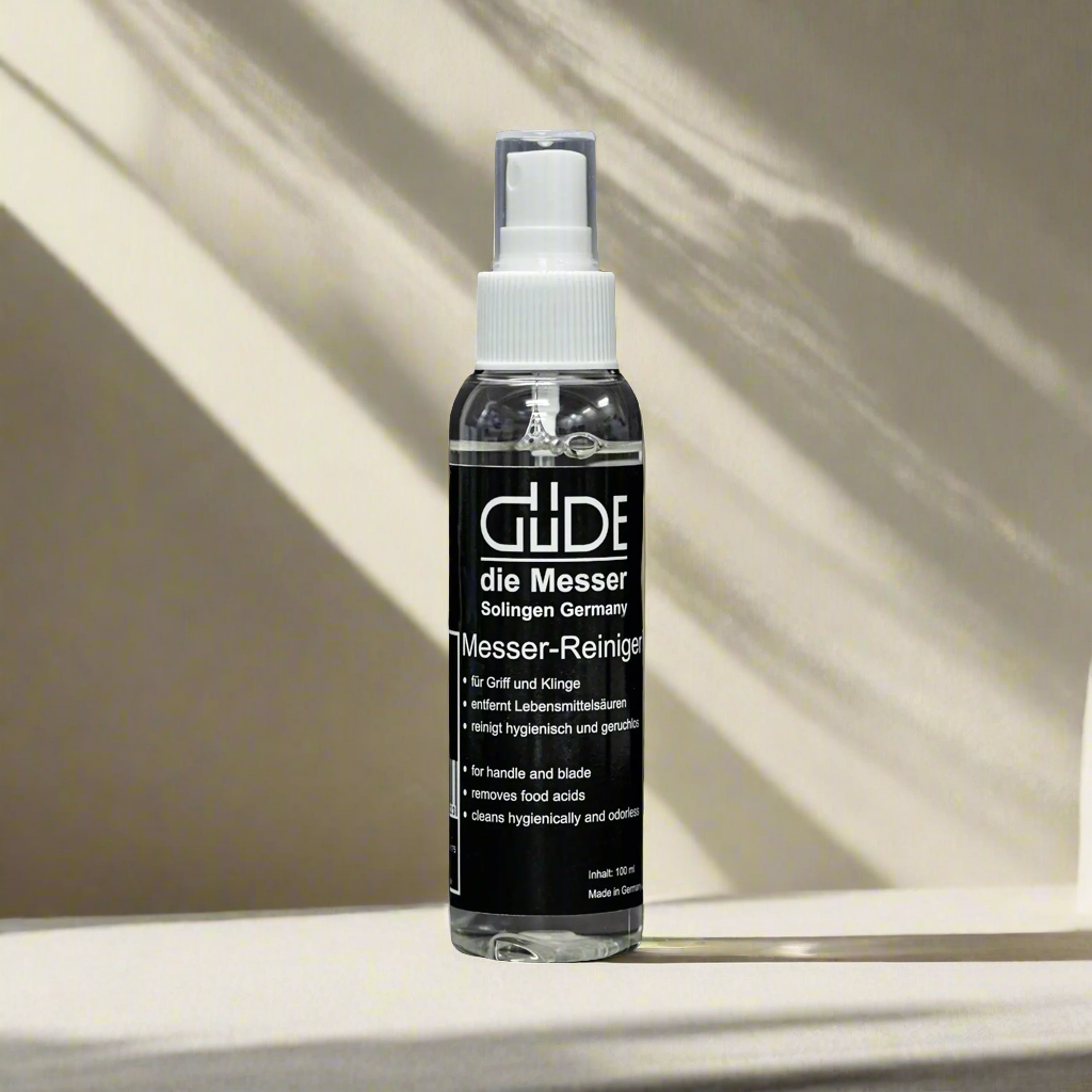 The GÜDE knife cleaner is versatile, effectively cleansing both handle and blade. With a pH level of 9.5, it efficiently eliminates food acids, ensuring hygienic cleanliness. Additionally, it is odorless, preventing any fragrance residue from adhering to the knife or contaminating food.
