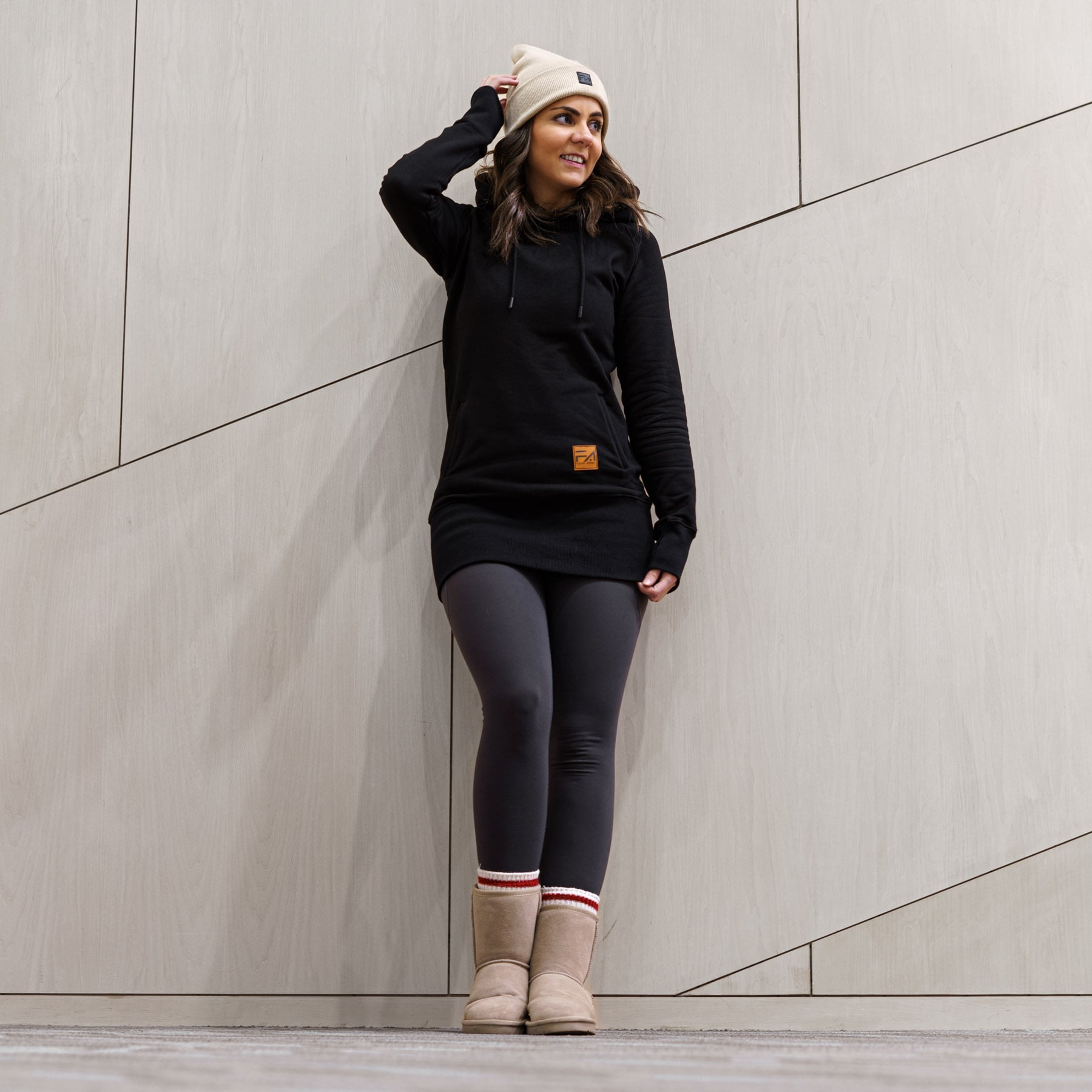 The Black Kora Long Hoodies are next level comfort. Made of a cotton spandex blend lets you indulge in all day comfort while still being able to move effortlessly throughout your day. The elongated body will ensure all your hard-earned assets are warm against the brisk temperatures. With a single kangaroo pocket, Flatout drawstring tips and eyelets, and a faux leather patch the small details perfectly complete your hoodie.