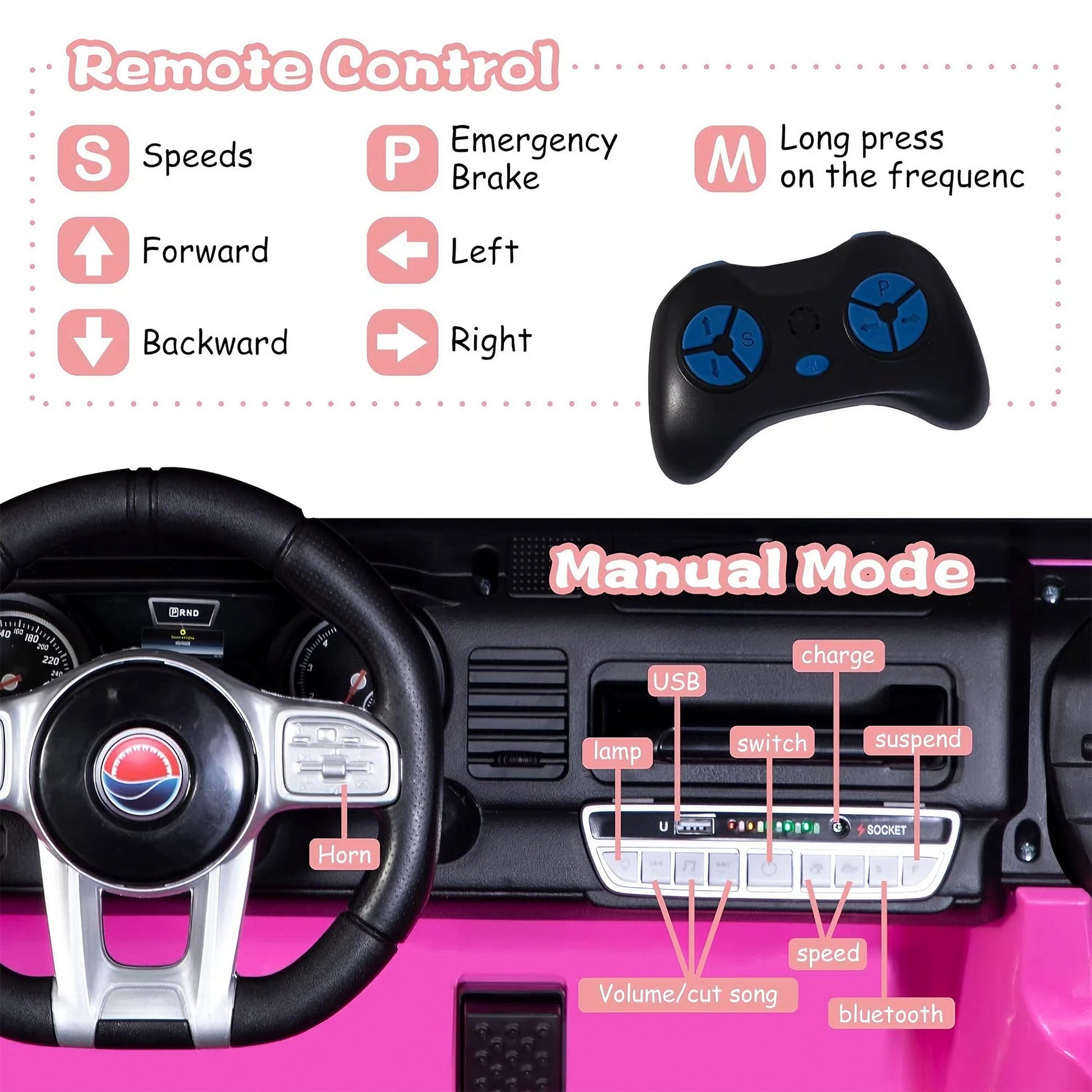 - Manual or Full Remote Operation modes, Long Range 2.4 Ghz Parental Remote Control with Secure Code Technology (Allows Operation of Multiple Vehicles without Interference Between Cars)