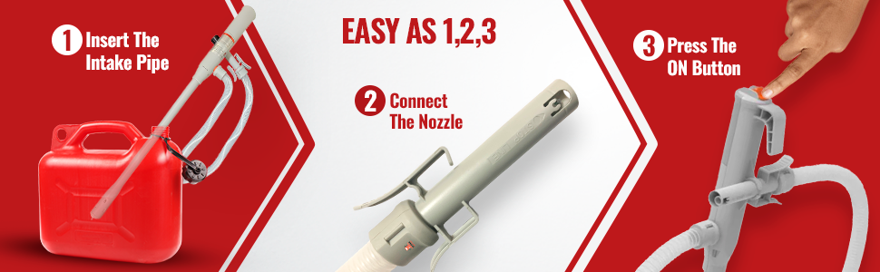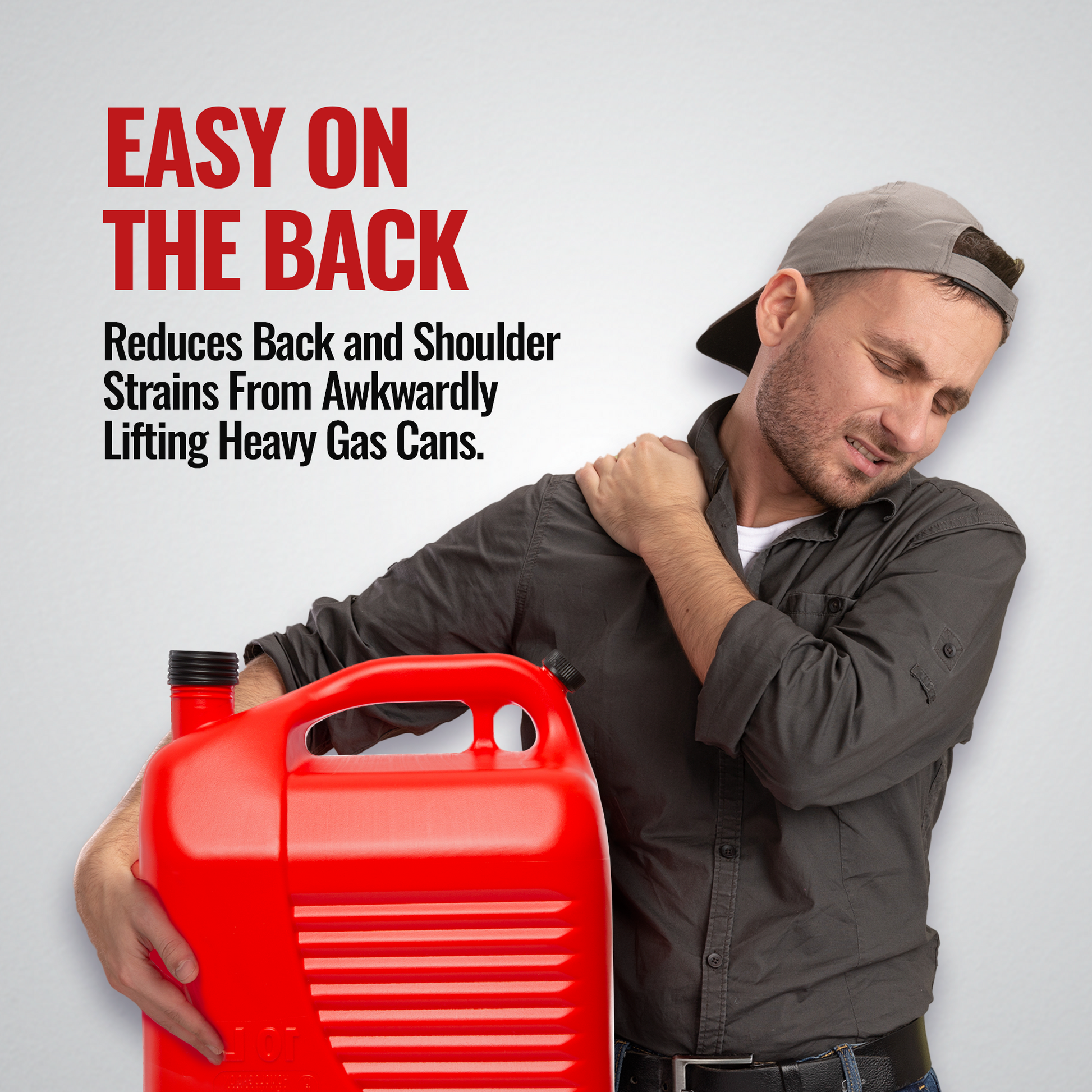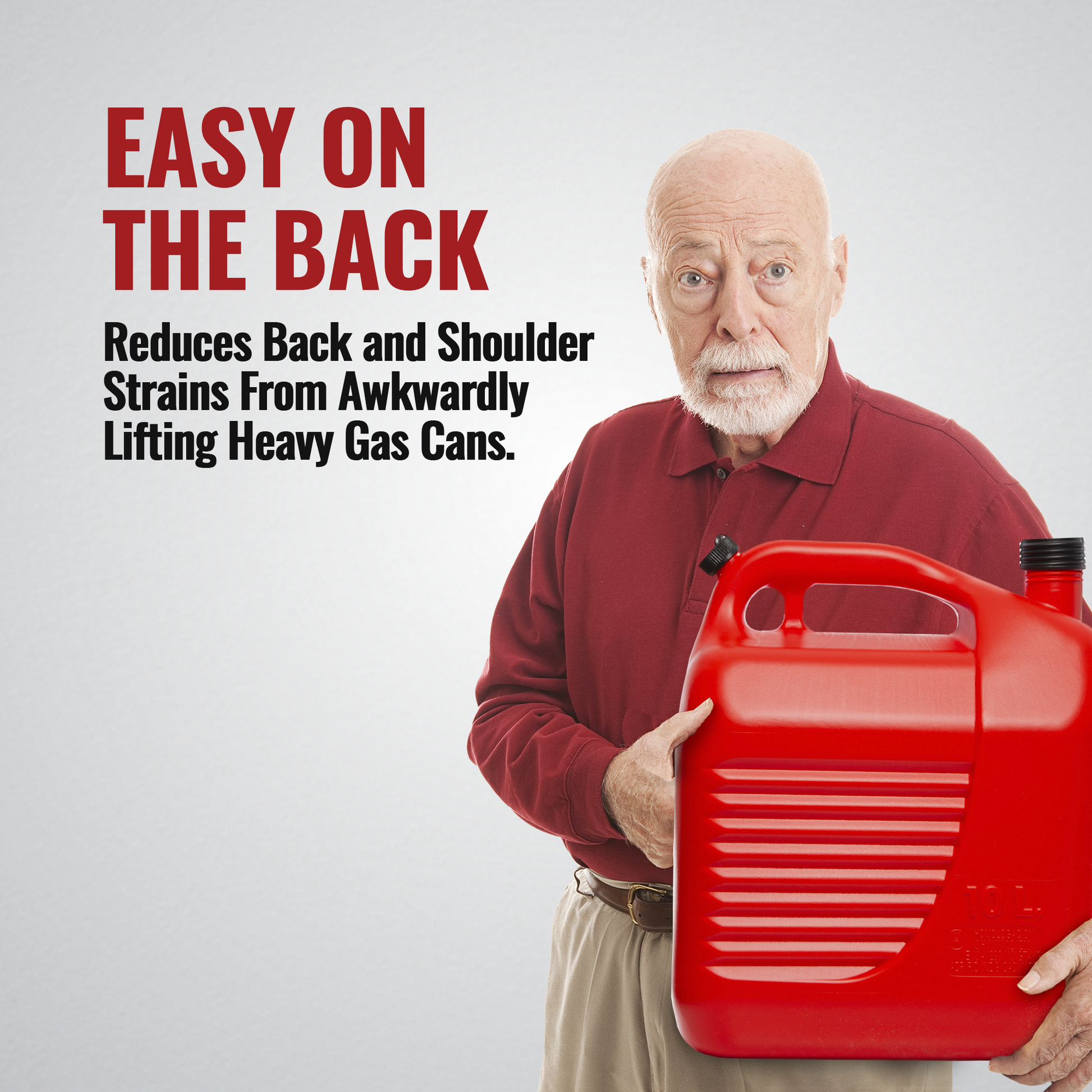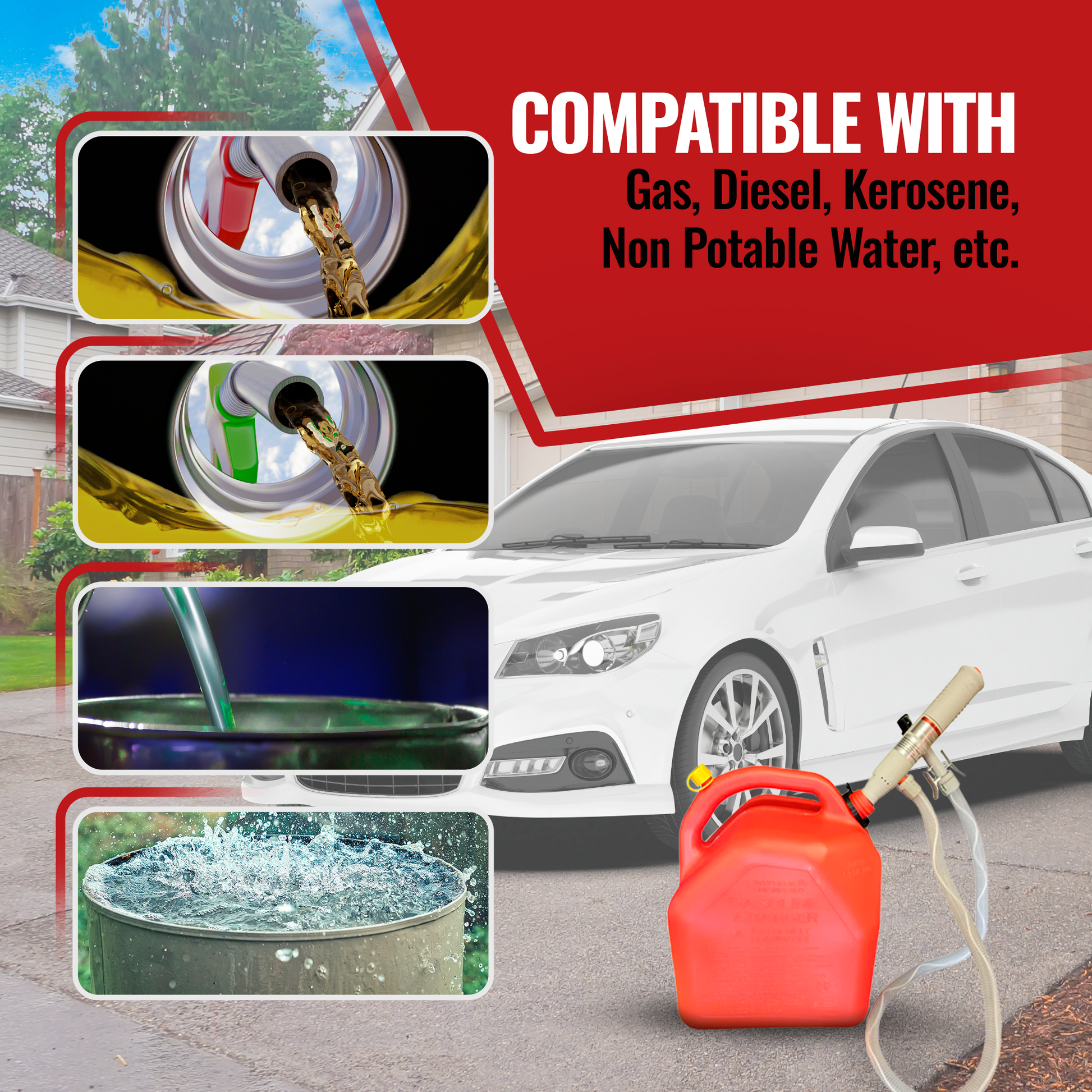 No spills. No lifting. Transfer gas, diesel, kerosene, or water with one hand.