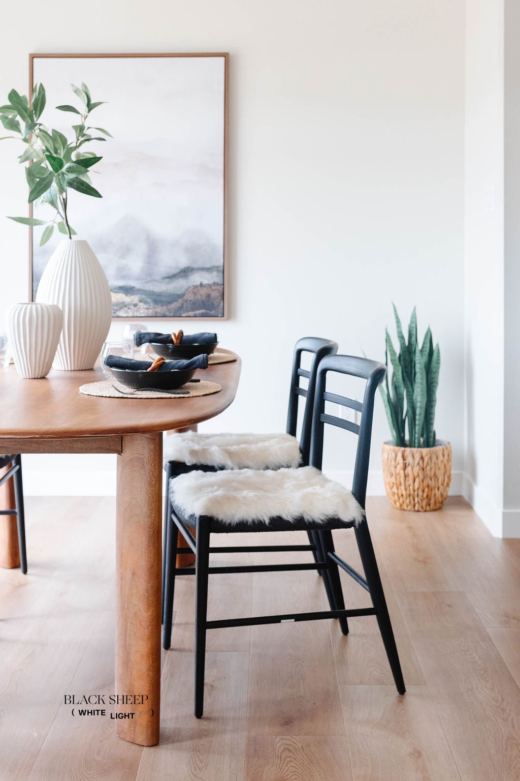 It is soft to touch, uses shorter wool and is extremely comfortable. The natural hue of this chair pad can vary from snow white to light cream. Consider placing this chair pad on a chair put against a darker backdrop to create a contrast effect that draws attention.