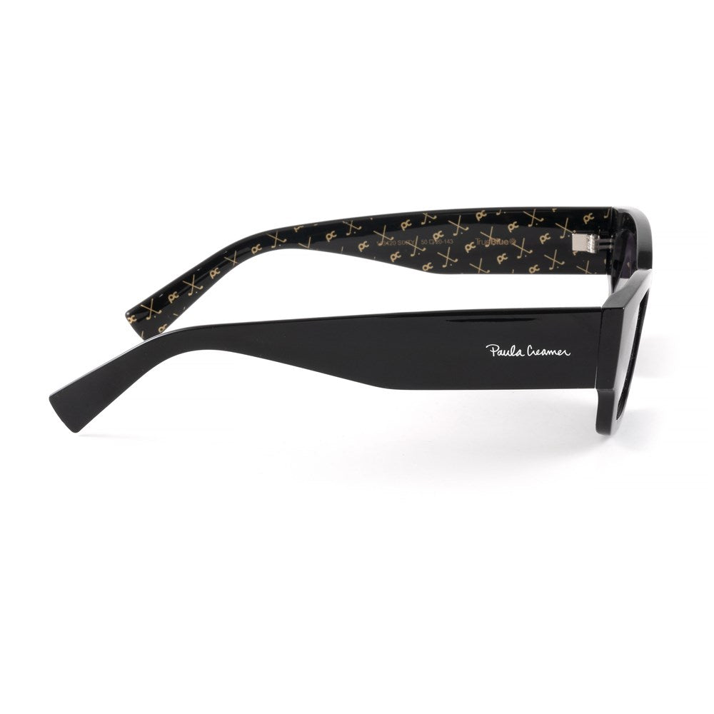 Modern elegance within a classic silhouette. Embracing the Paula Creamer style ethos, these sunglasses offer a contemporary twist in a sleek all-black design, exuding sophistication. "Sixty" merges the timeless appeal of a classic silhouette with modern elements, featuring wide temples that add a bold yet refined touch. Elevating its allure, the temples boast an exclusive "PC" inlay, introducing a designer's flair to this high-fashion piece. Crafted to stand out, these sunglasses encapsulate the essence of high-end designer fashion, presenting a statement accessory for those seeking both style and substance.
