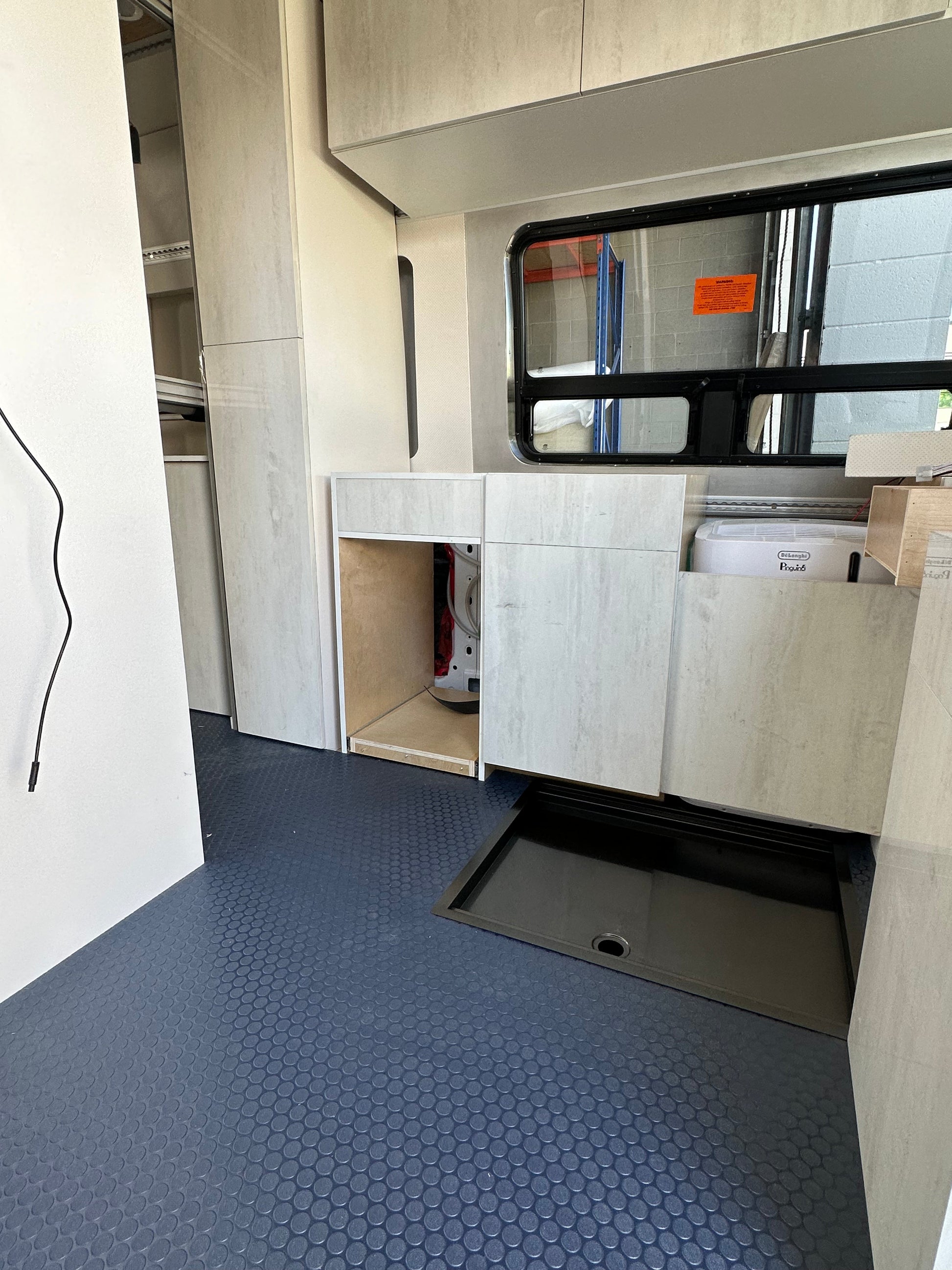 - Off-Center Drain Placement: Specifically designed to align with popular installation spots in Sprinter, Transit, and Promaster vans. Ideal for locations like beside the sliding door, ahead of the driver-side wheel well, or near the rear door, the drain placement accommodates a variety of layouts while considering the van frame’s structure.