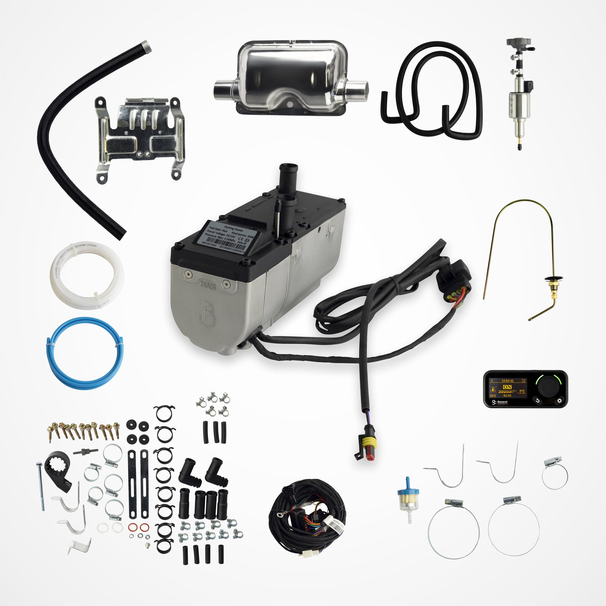 - Complete Installation Kit: Includes a mounting bracket, hardware, fuel pump, fuel line, wiring harness, exhaust pipe with muffler, coolant pump, screws, clamps, and straps.