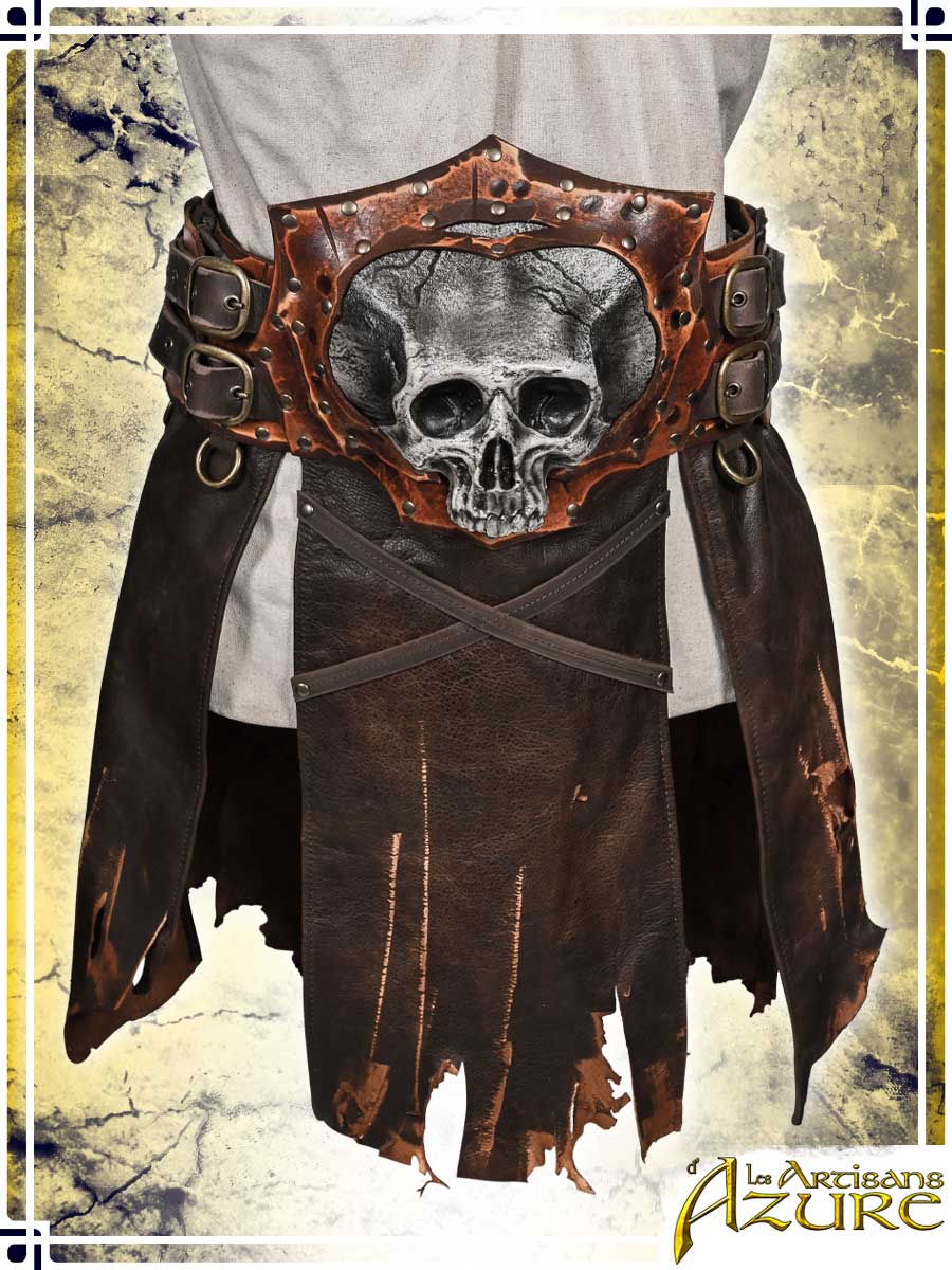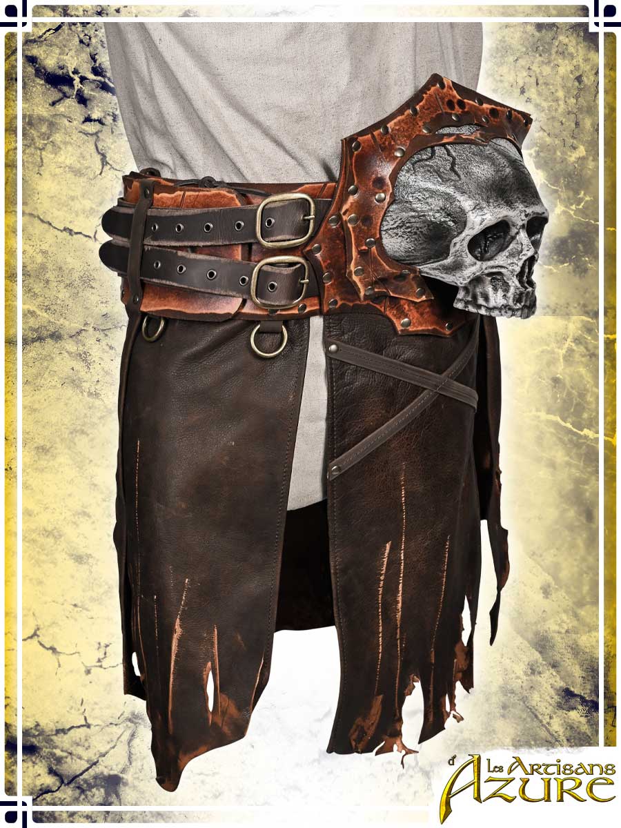 Available with or without the skull, the combat belt is a wide and imposing piece with a double set of belts as well as metal rings that can be used to hold armored tassets or various grim talismans and accessories. Long pieces of supple leather hang from the belt, a battle skirt of the sort that lengthens the figure and add some flare to the character when in motion. The belts can also support all the classic gear needed in LARP such as a scabbard or a matching pouch. Because of the aging patina and the voluntary use of imperfect hides to craft these sets, each piece is guaranteed to have subtle unique features, natural skin texture, and scars enhancing the final product with details that cannot easily be imitated by the artisan, making it the perfect belt for a feral barbarian, clan champion or any other savage shaman.