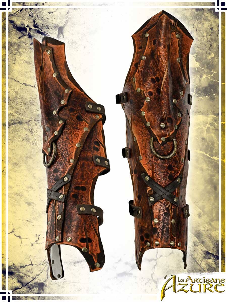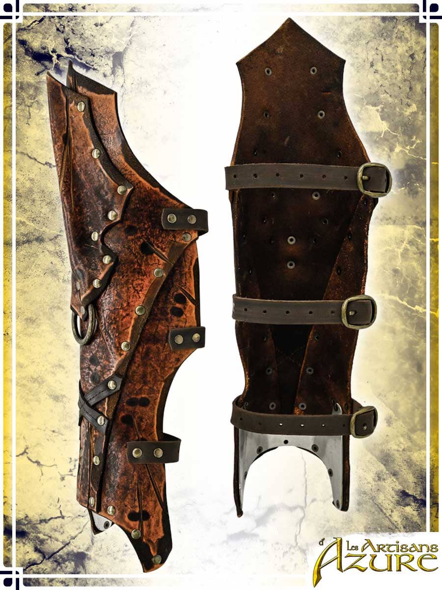 These dark fantasy leather greaves display a rough and aged finish that fits perfectly for tribal warriors, wild champions, barbarian warlords, and grim rangers in LARP. Adjustable with straps, they are further embellished by the use of imperfect leather, each piece having its own little scars, scratches and texture that makes them look more rugged.