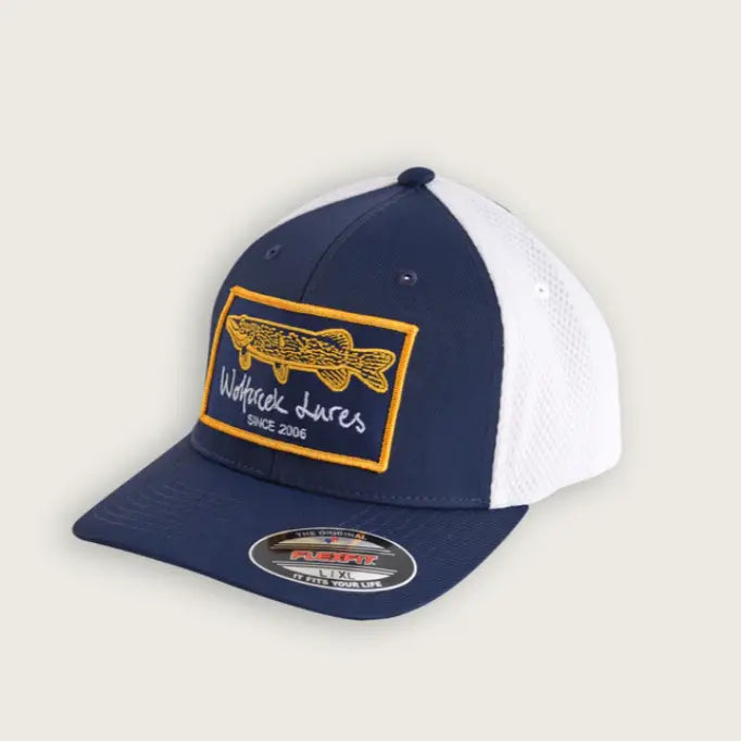 Classic Yupoong Airmesh 2-tone Flexfit in Navy/White with embroidered Pike Logo Patch.